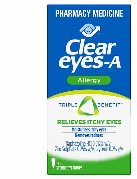 Clear Eyes-A is a uniquely formulated sterile eye drop that not only removes redness and moisturises your eyes, but also has an extra ingredient for relief of airborne allergen symptoms. It is a triple-action formula that clears away mucus buildup and relieves the itching associated with exposure to airborne allergens.